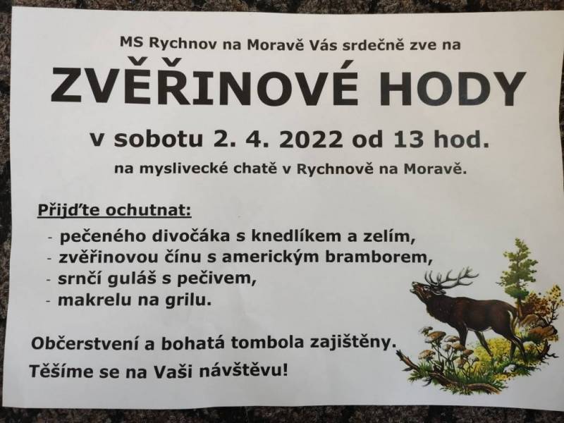 Myslivecký spolek Rychnov na Moravě Vás srdečně zve na Zvěřinové hody, které se konají v sobotu 2. dubna od 13 hodin na myslivecké chatě.