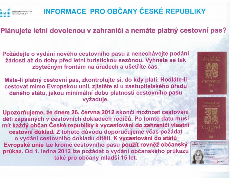 Ministerstvo vnitra České republiky si dovoluje informovat občany na to, že od 26. června 2012 musí mít každý občan ČR k vycestování do zahraničí vlastní cestovní doklad, končí tedy možnost vycestování dětí zapsaných v cestovních dokladech rodičů. Dále MVČR připomíná, abyste podání žádosti nenechávali na poslední chvíli, vyhnete se tak frontám na úřadech a ušetříte svůj čas. Více informací naleznete v příloze.
